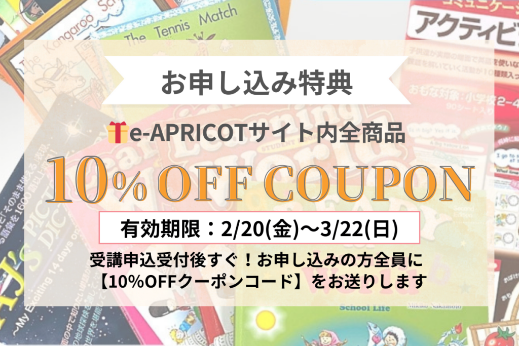 アプリコット出版より、今回のセミナーを受講される先生方へ、e-APRICOTサイト内全ての商品に使用できる10%クーポンを特別に発行していただきました!
